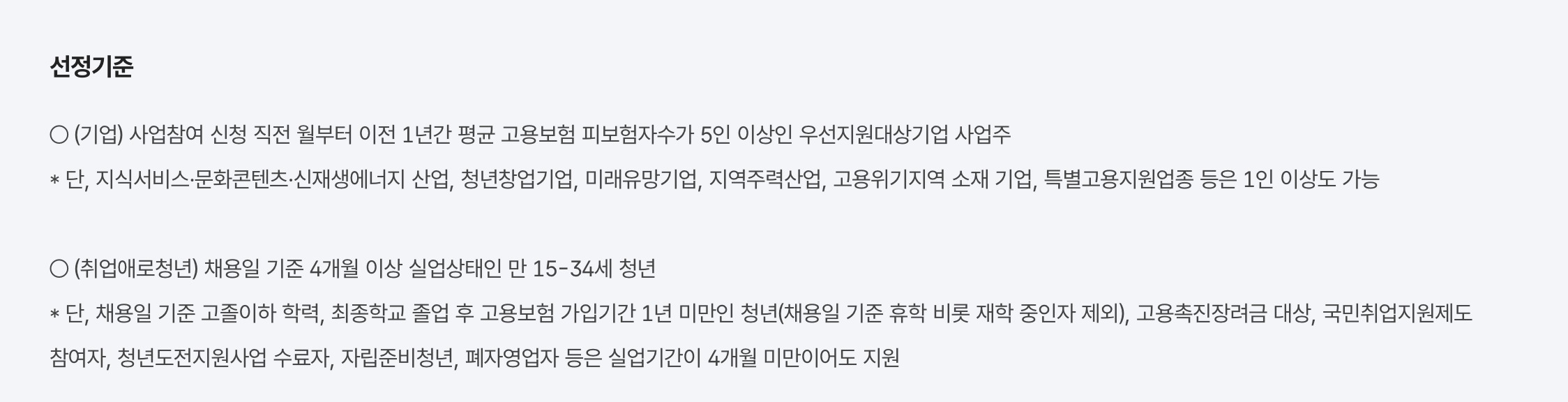 - 기업 요건: 신청 직전 월부터 1년간 고용보험 피보험자 수 5인 이상인 우선지원대상기업